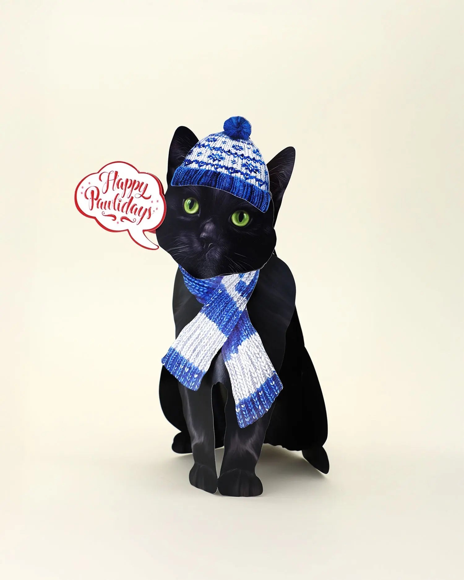 Embrace the spirit of the season with our Holiday Pop-Up Black Cat! Each adorable pop-up cat features two selections of charming interchangeable accessories: one holiday-themed. the other for the everyday. You'll also receive a beautifully decorated mailing envelope and a matching notecard. For an extra personal touch. you can add a customizable speech bubble. perfect for sharing cheerful messages with your loved ones.