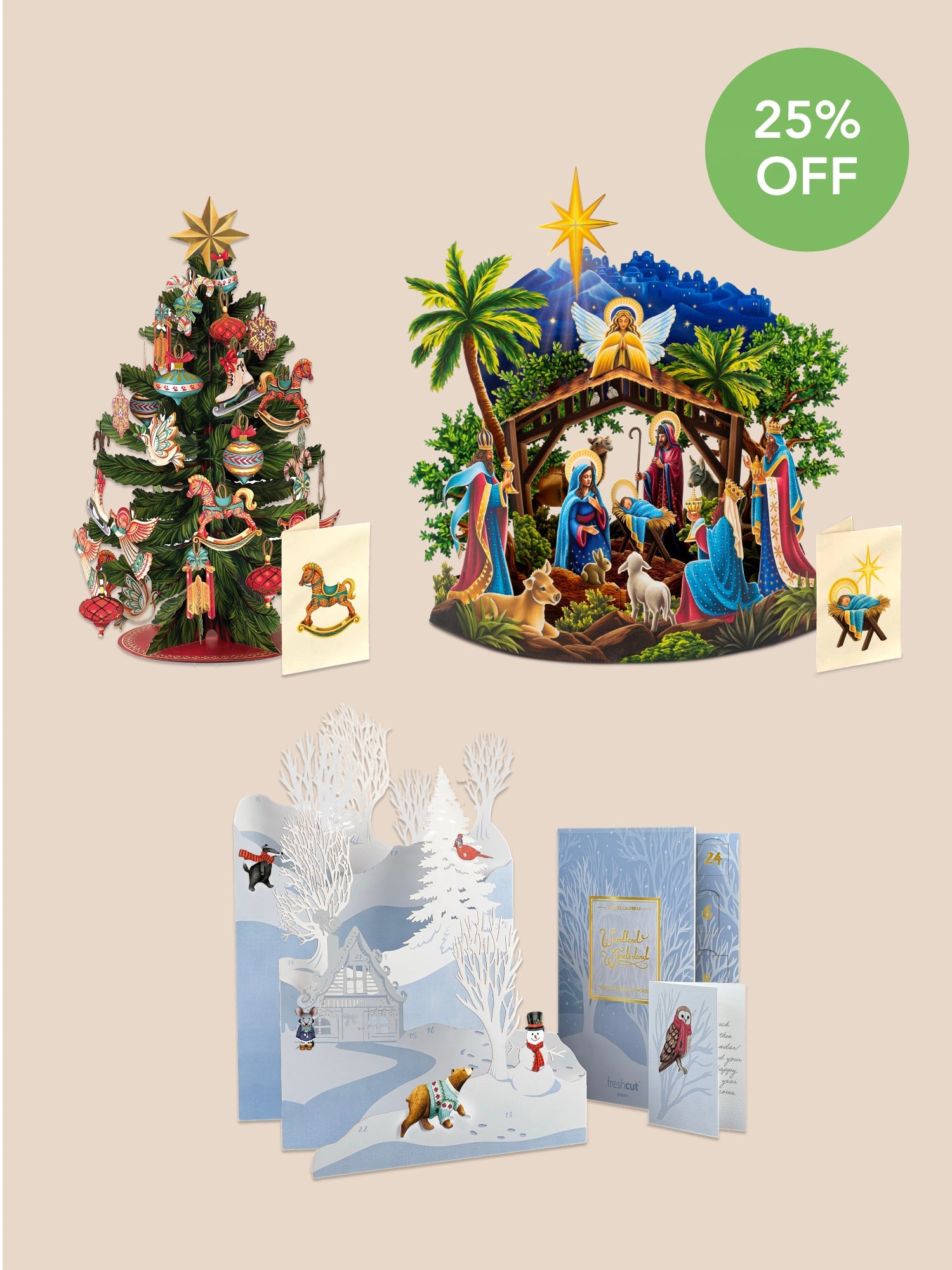 The Christmas Cheer Bundle brings together fun. tradition. and festive beauty in one joyful set. This curated trio includes the interactive Woodland Wonderland Advent Calendar. a richly illustrated Christmas Tree Pop-Up. and the timeless Starlit Nativity. Perfect for families and holiday enthusiasts alike. this bundle creates a full seasonal experience — from counting down the days to decorating your space with meaningful. reusable pieces. A heartwarming holiday activity and display. all at 25% off.