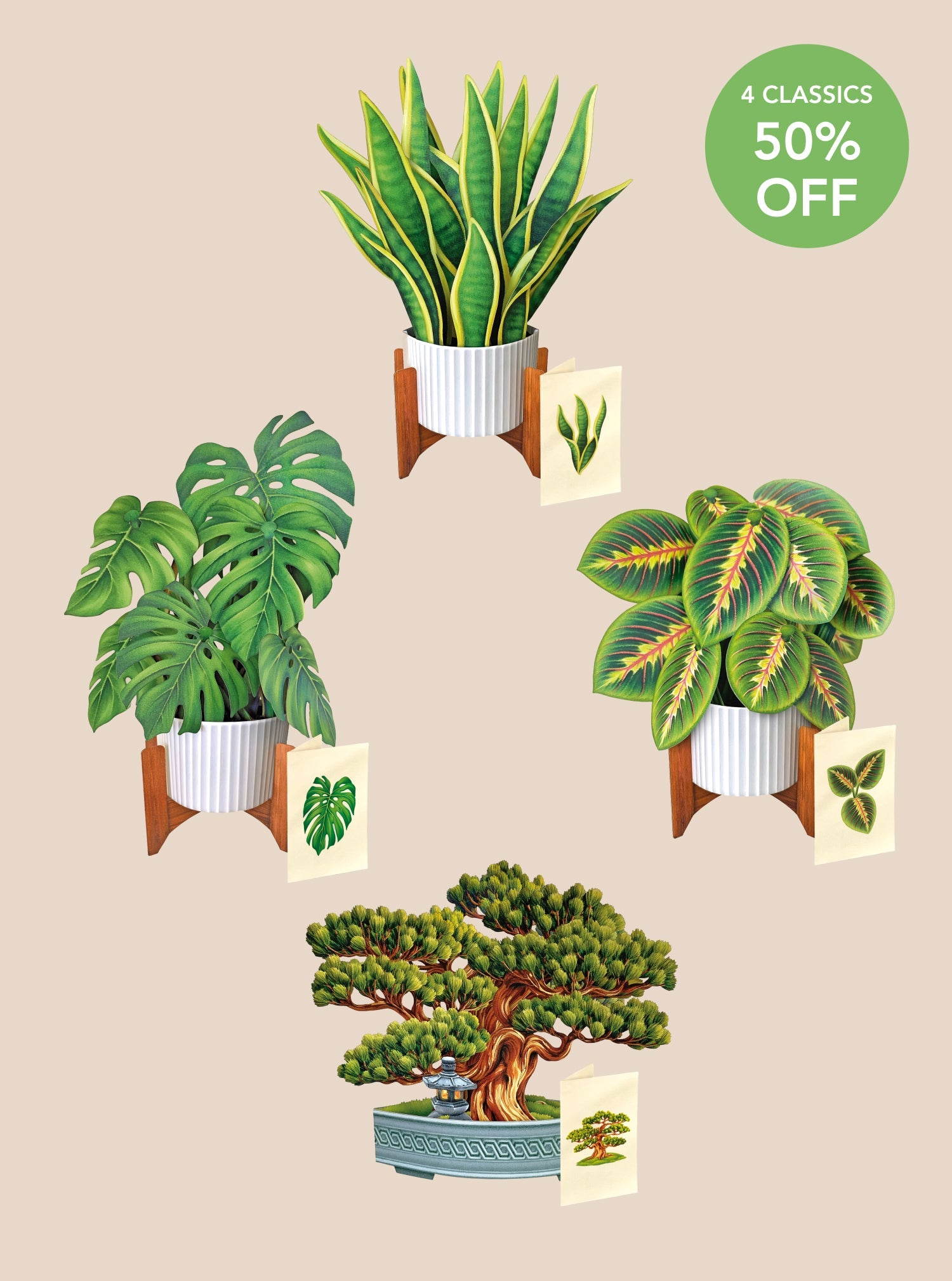 Bring everlasting greenery into your space with the Classic Houseplants Bundle. a stunning collection of lifelike paper plants designed to add natural beauty without the need for upkeep. This vibrant set features four of our favorite houseplants; the bold and structured Snake Plant. the tranquil and elegant Wisdom Bonsai. the lush and tropical Monstera Plant. and the intricately designed Prayer Plant. each crafted with remarkable detail. Perfect for home décor. gifting. or brightening up your workspace. this zero-maintenance bundle brings the charm of real plants without watering or sunlight. Add a touch of nature to your life with this eco-friendly. everlasting botanical collection.