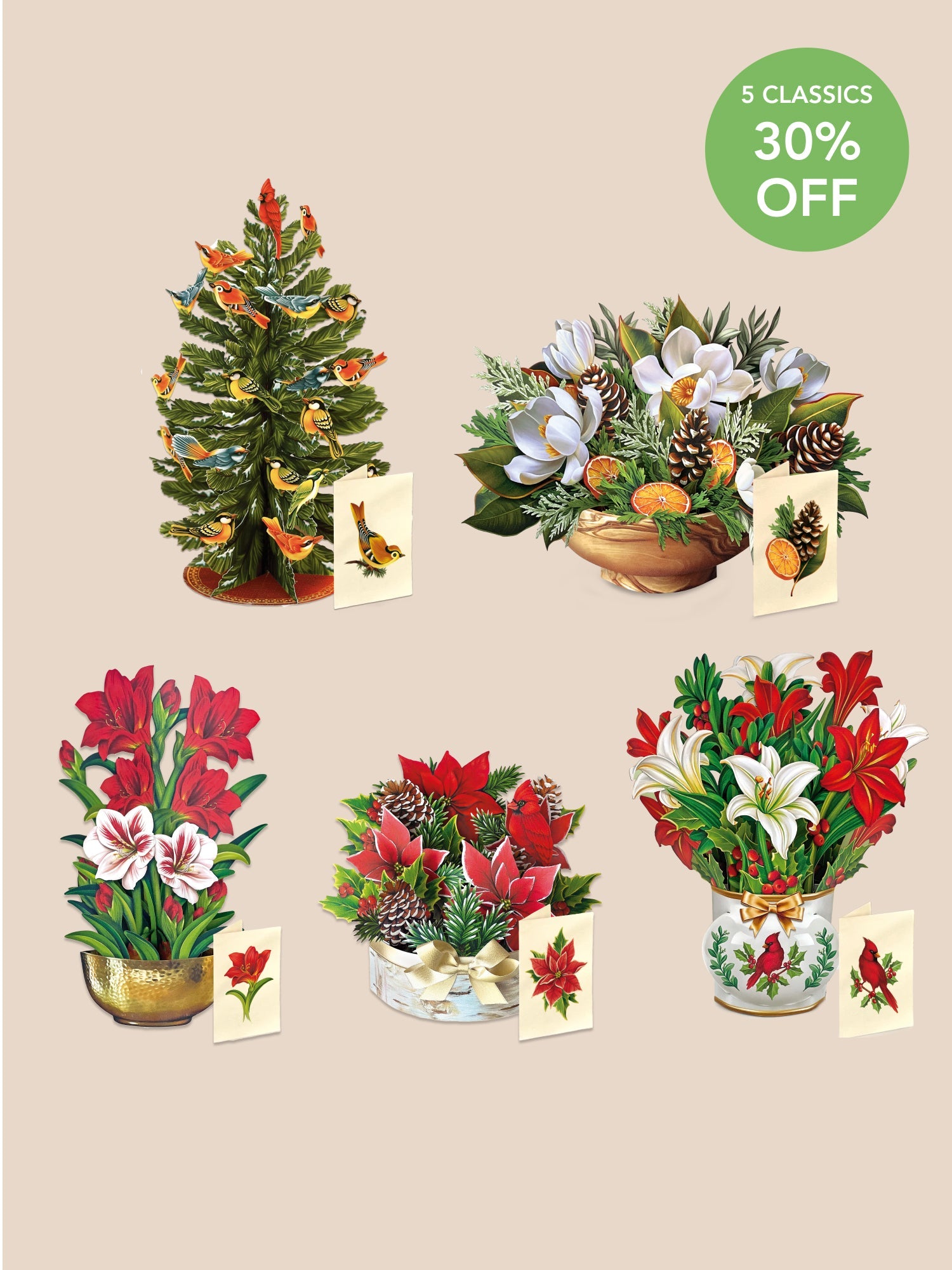 Celebrate the season in style with the Classic Winter Wonder Bundle — a curated set of our five best-selling holiday pop-up cards. Ideal for decorating multiple rooms. sharing across several recipients. or tackling your entire holiday gifting list in one go. Each bouquet and tree arrives flat. opens into an elegant display. and brings lasting cheer without the need for wrapping or water. A joyful bundle at 30% off.